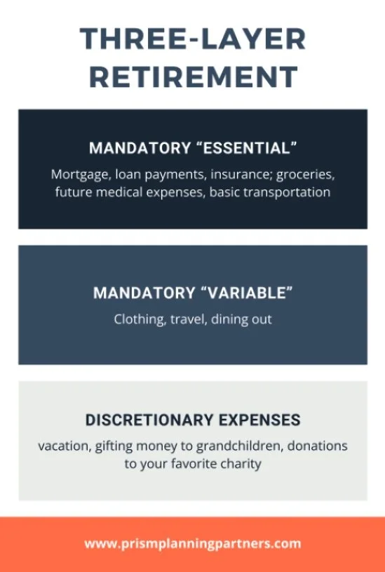 At Prism, we think about budgeting in a slightly different way than most. Yes, we still think some expenses are “mandatory” and others are “discretionary.” But, when you’re saving for the retirement you really want, it helps to add a layer to the “mandatory” column. We refer to retirement expenses as Essential, Variable, and Discretionary. Essential and Variable expenses take care of you (and are “mandatory”), whereas we think of Discretionary expenses as how you can help others more substantially.